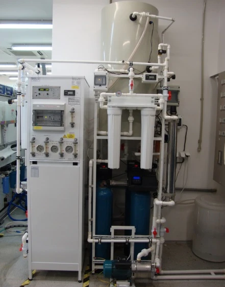 RO EDI treatment device including UV lamp system. RO EDI (Reverse Osmosis with Electrodeionization combined in one treatment device) is designed for pharmacies and laboratories that need water with a purity ≥ 15 MΩ cm. It is based on the production of very pure water without the need to use of ion exchangers. This technology achieves a large amount of financial savings compared to conventional ion exchange modifiers (minimum service costs of RO EDI). |